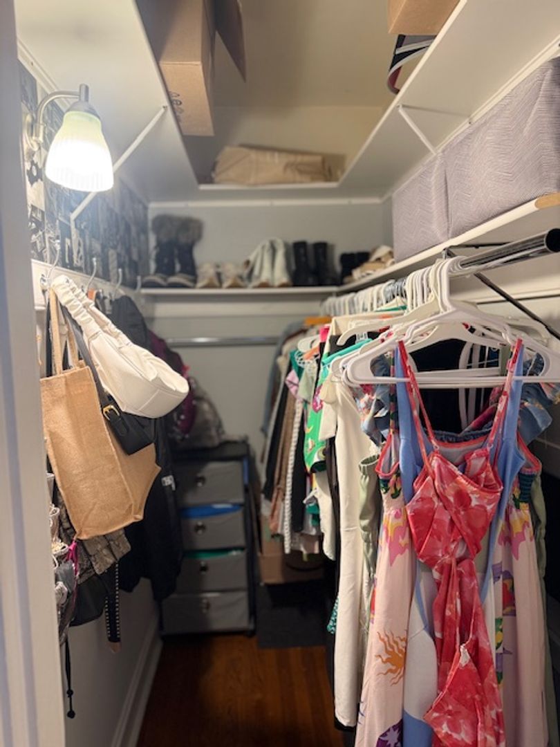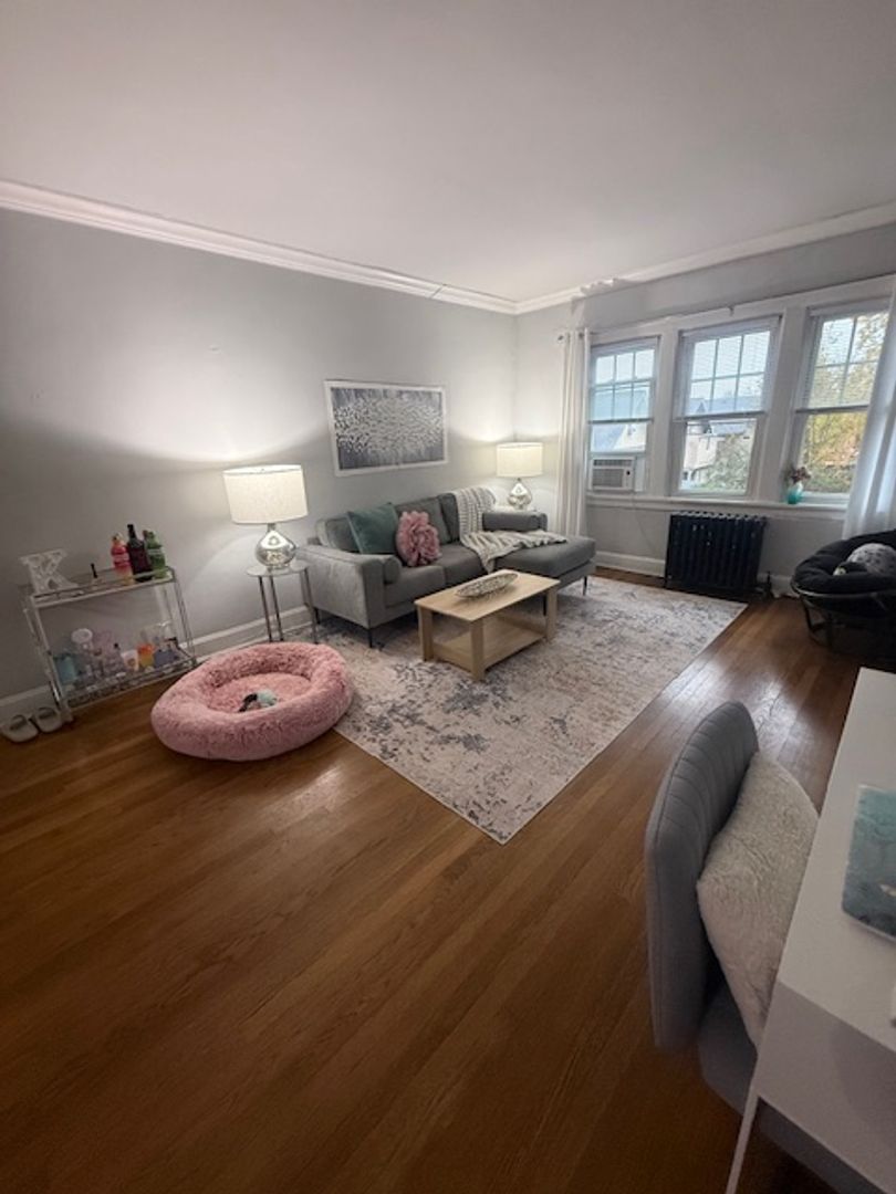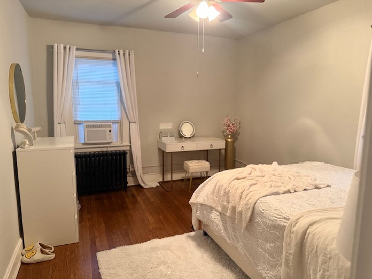 Large kitchen with stainless steel appliances (gas stove, refrigerator, dishwasher, microwave). Hardwood floors in the dining room, living room, and bedroom. A walk-in closet in the living room and built-in storage outside of the bathroom. Updated windows throughout and two window AC units provided.