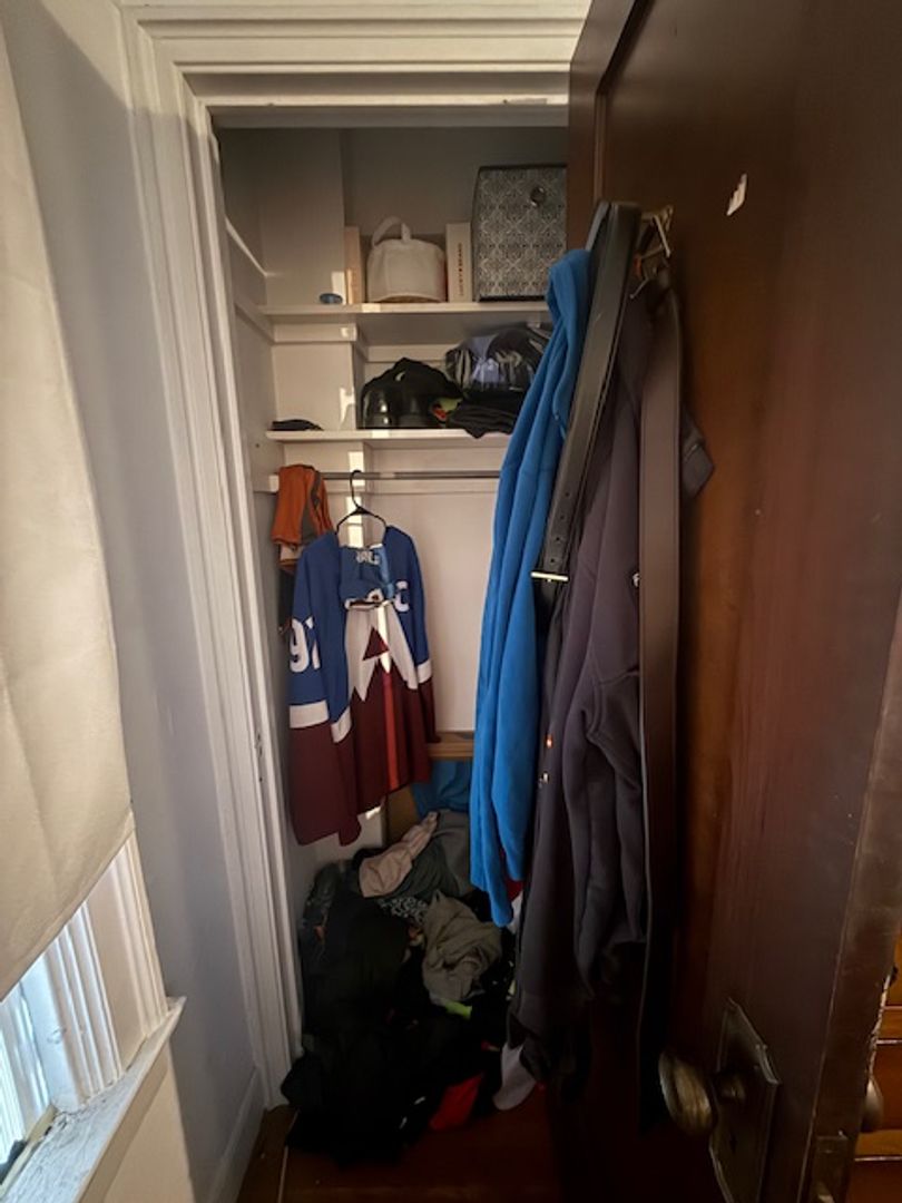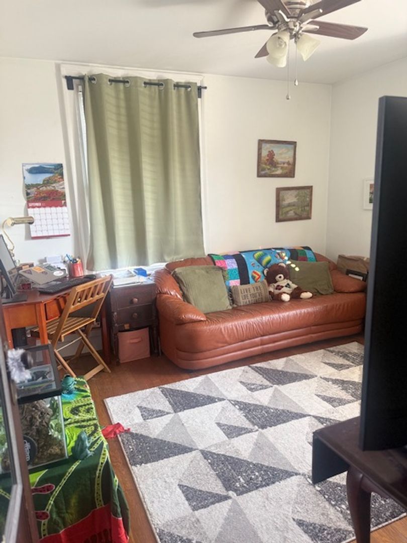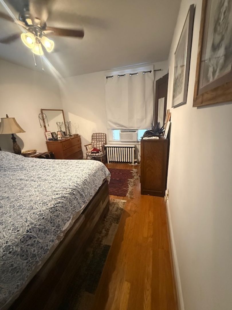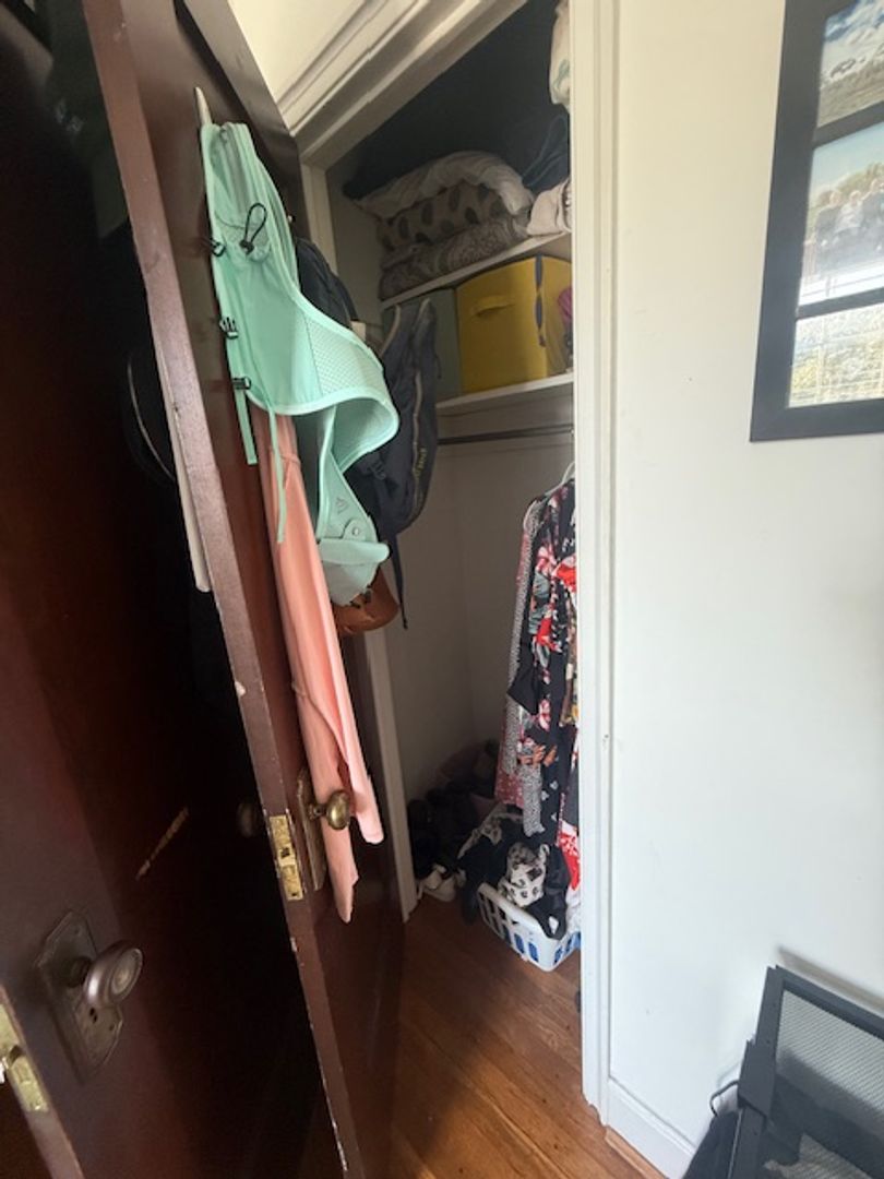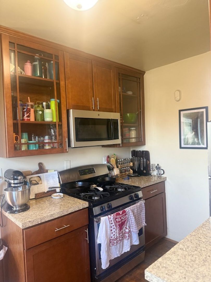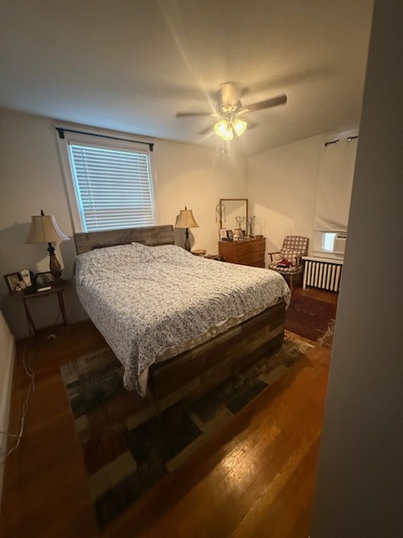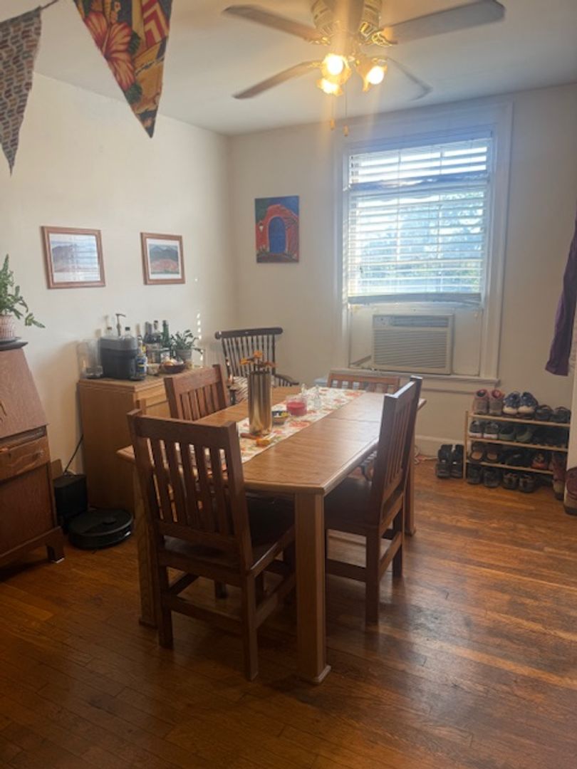 Large kitchen with stainless steel appliances (gas stove, refrigerator, dishwasher, microwave). Hardwood floors in dining room, living room, and bedroom. The Kitchen floors will be redone with tile like LVT. A large closet in the living room, bedroom and outside the bathroom. Two window AC units provided.