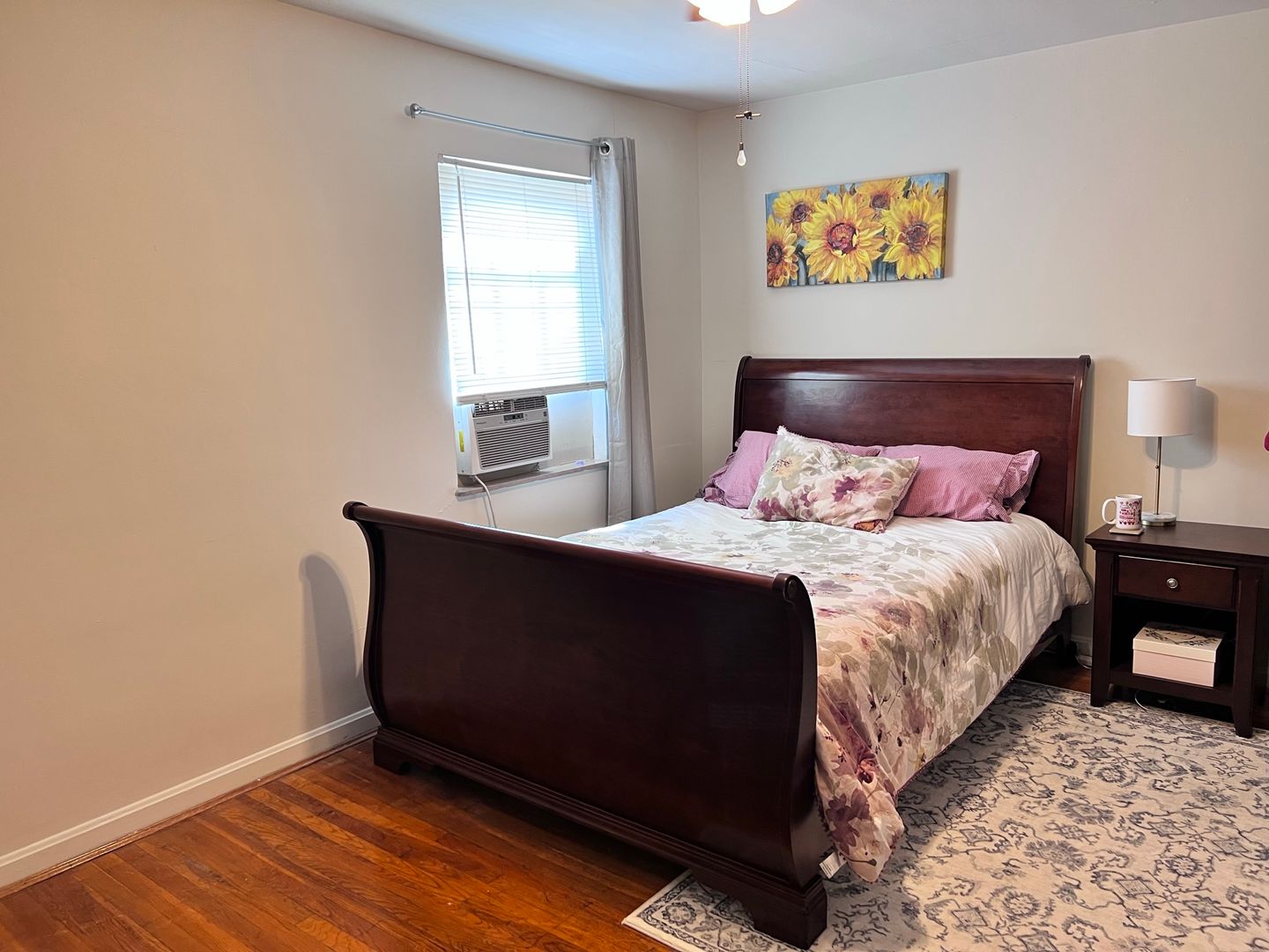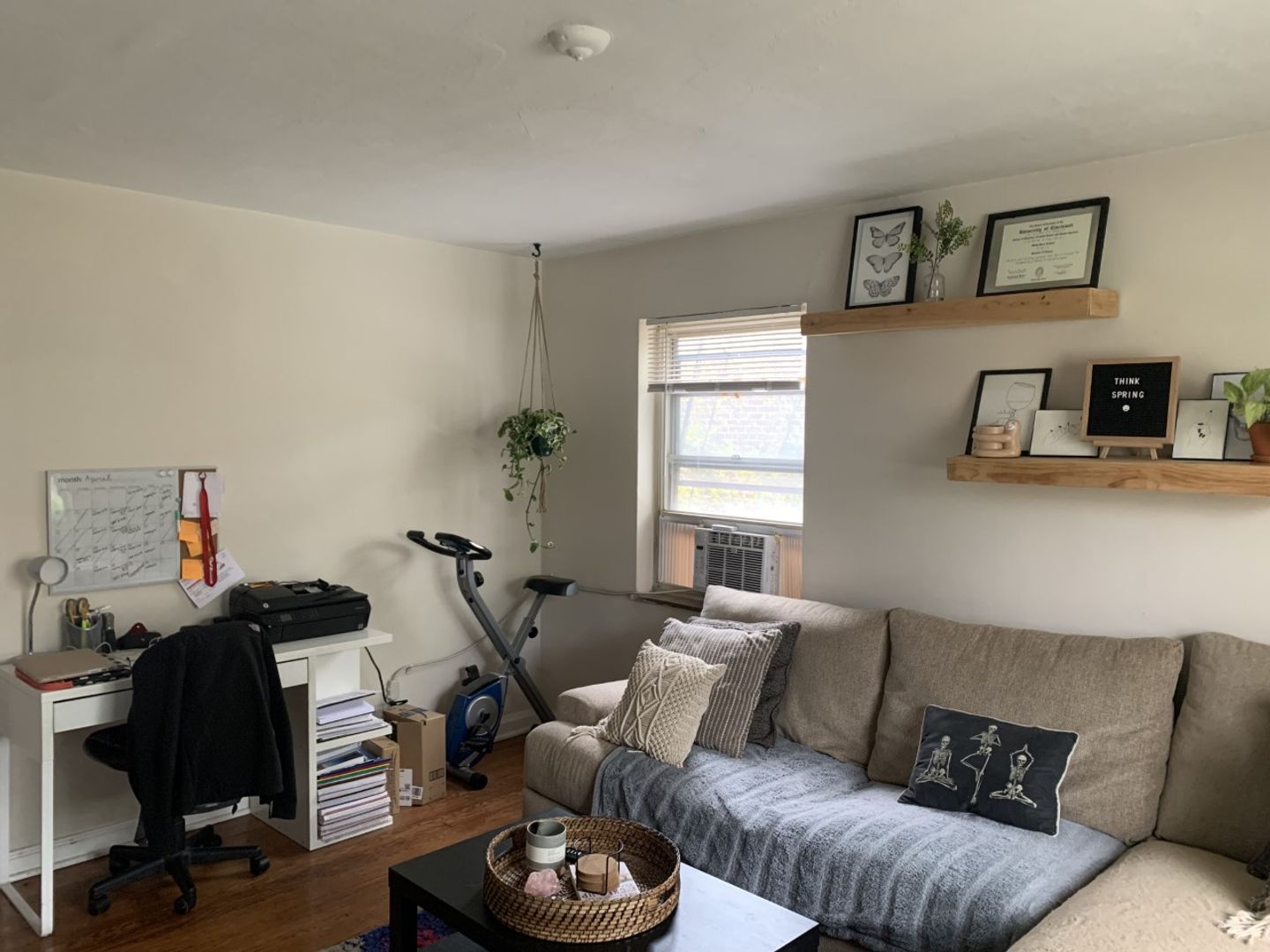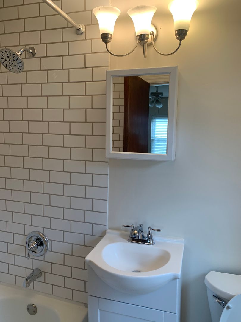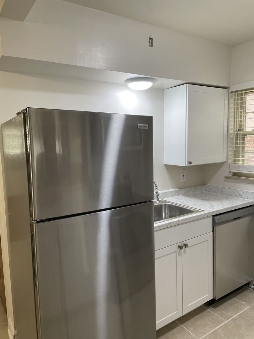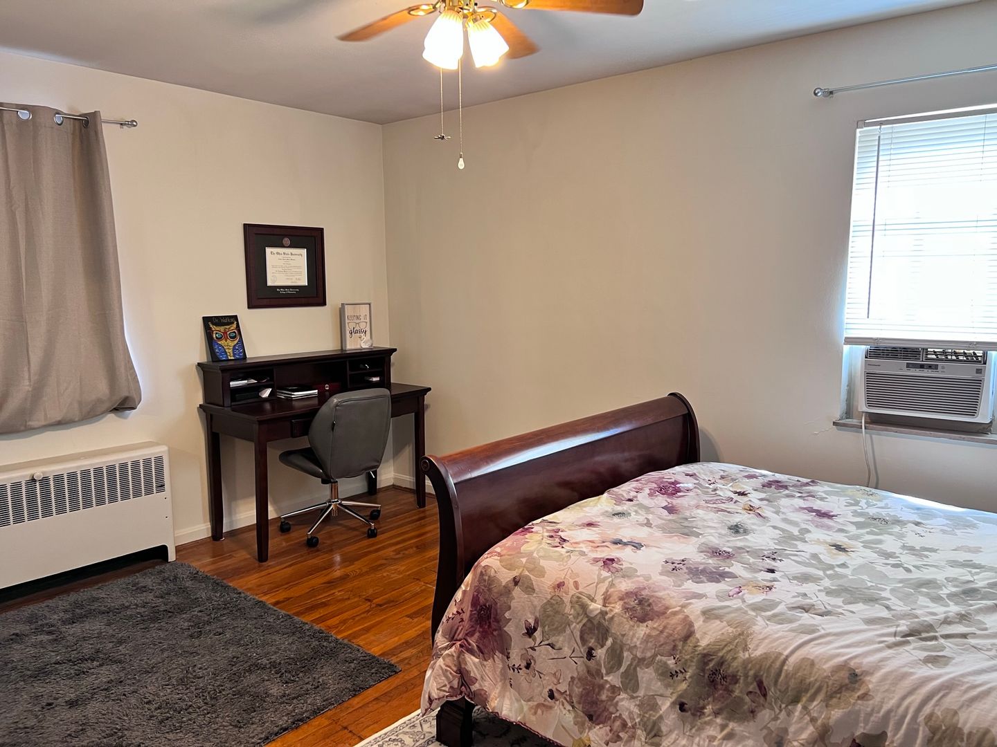 This spacious apartment has hardwood floors, kitchen is renovated with white shaker cabinets, faux granite counter tops and stainless steel appliances (Refrigerator, stove, dishwasher and microwave). There is an opening into living room from kitchen for a more open feel. Eat in kitchen that is large enough for a table and chairs. Bathroom has been updated with new vanity, lights, mirror and subway tile. Plenty of storage with coat closet in living room, pantry in kitchen, linen closet in bathroom and a walk in closet in the bedroom. Baseboard heaters, and two window AC units provided.