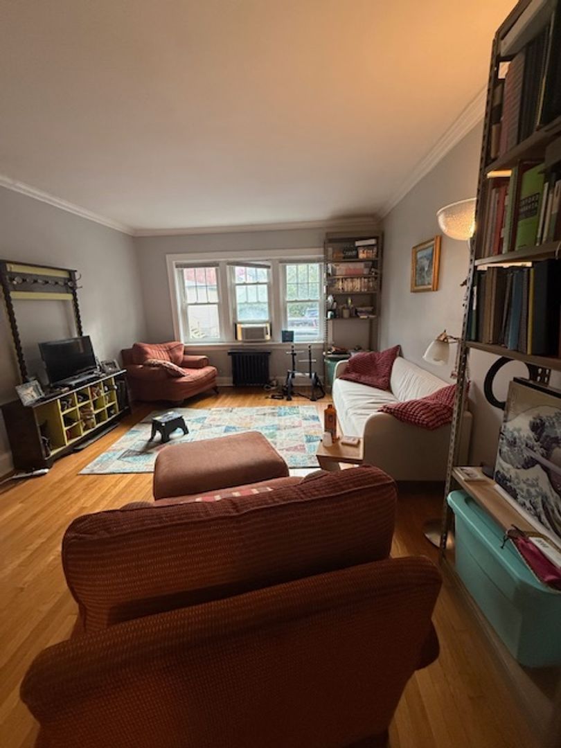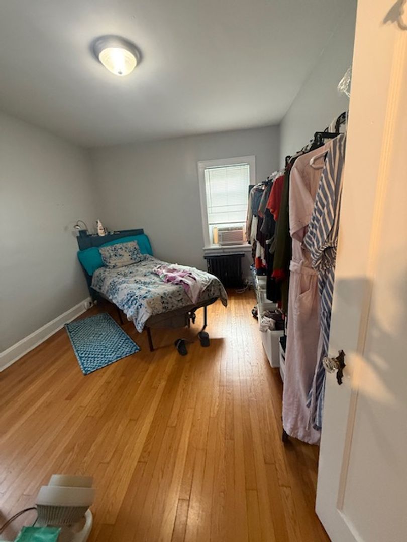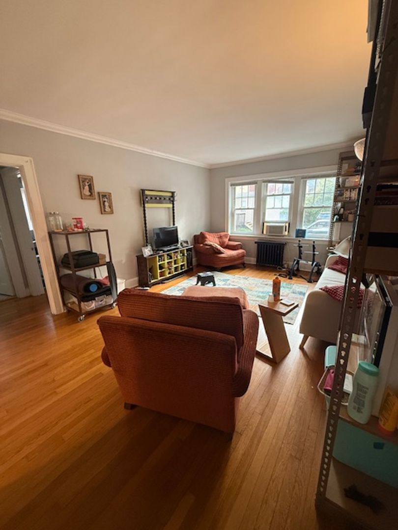 Large kitchen with stainless steel appliances (gas stove, refrigerator, dishwasher, microwave). Hardwood floors in the dining room, living room, and bedroom. A walk-in closet in the living room and built-in storage outside of the bathroom. Updated windows throughout and two window AC units provided.