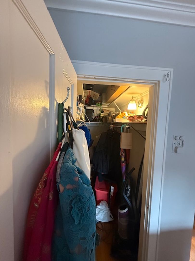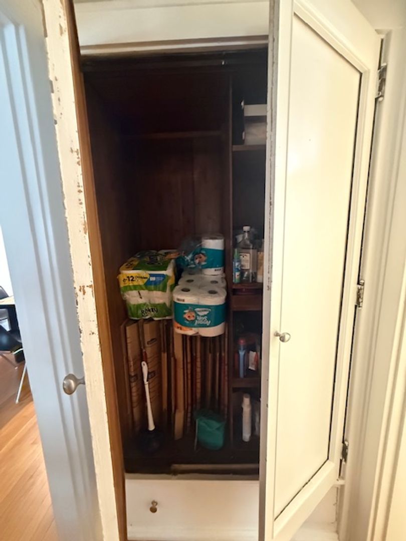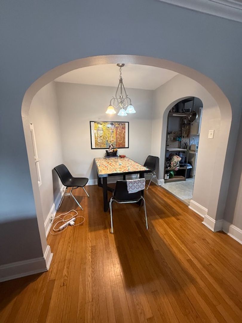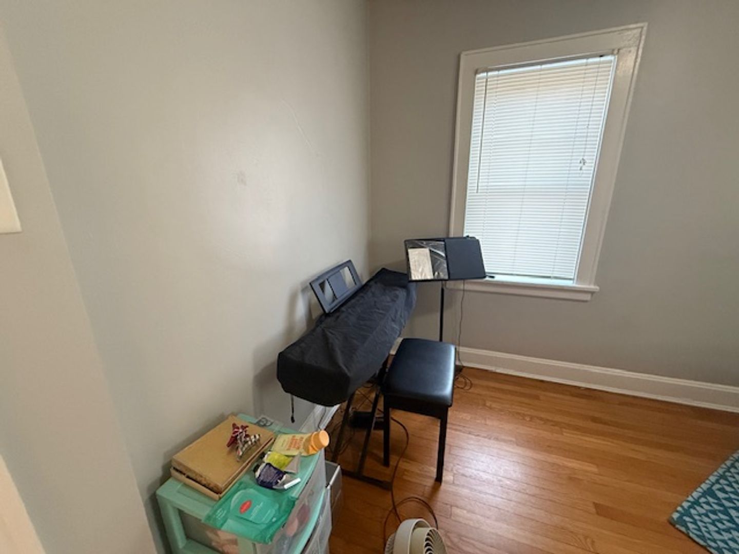 Large kitchen with stainless steel appliances (gas stove, refrigerator, dishwasher, microwave). Hardwood floors in the dining room, living room, and bedroom. A walk-in closet in the living room and built-in storage outside of the bathroom. Updated windows throughout and two window AC units provided.