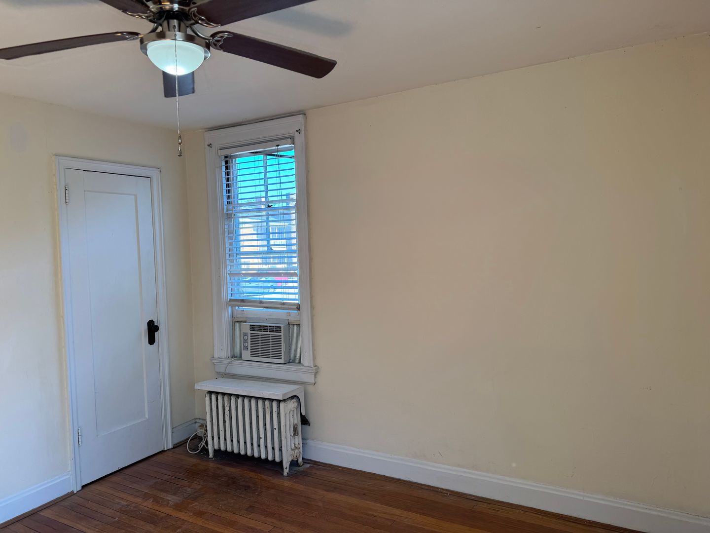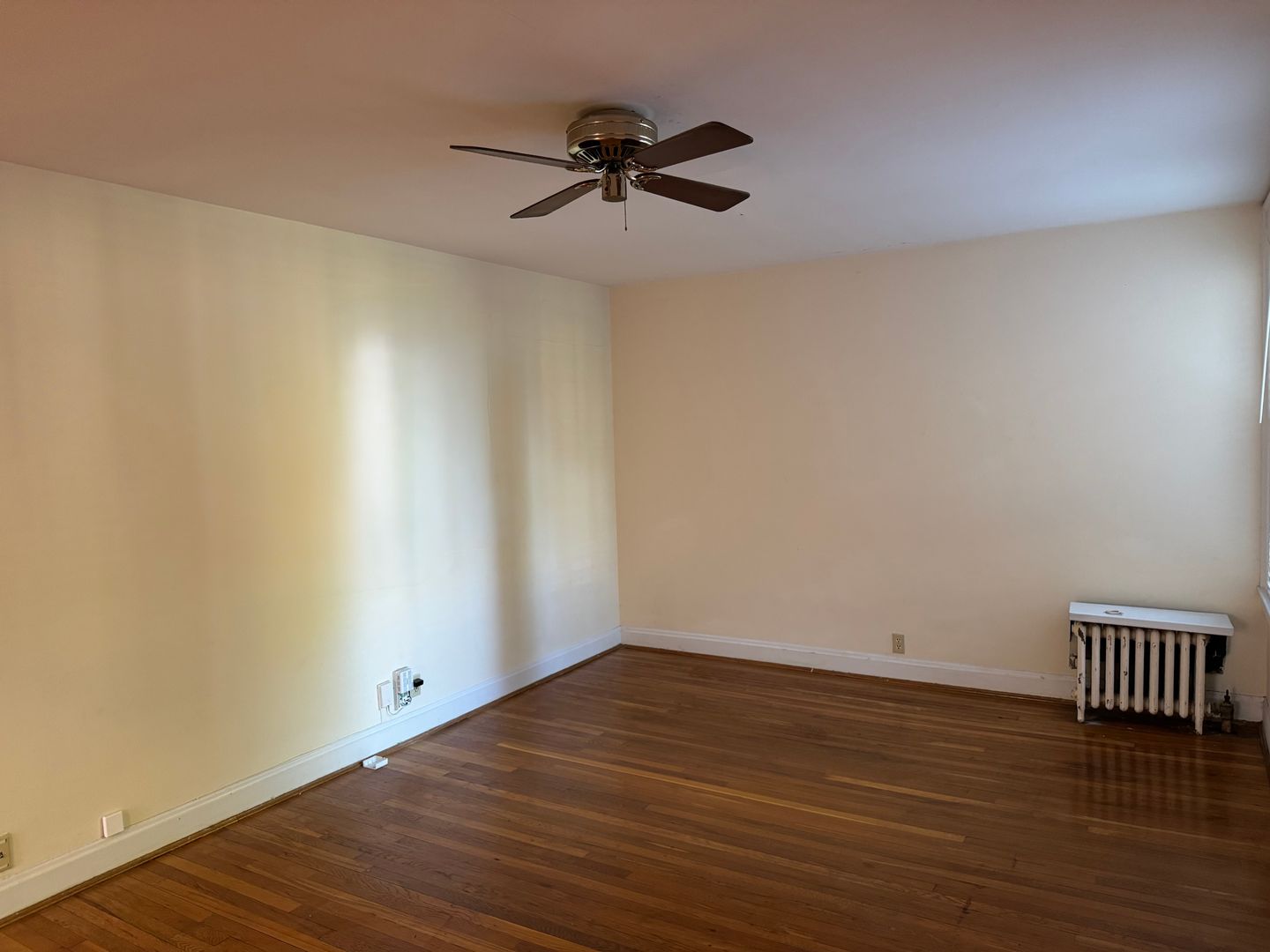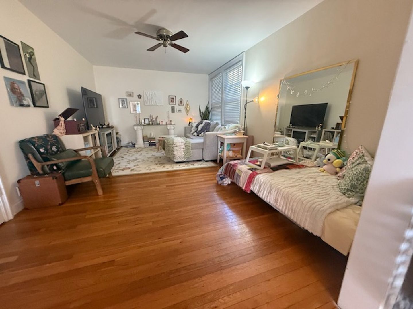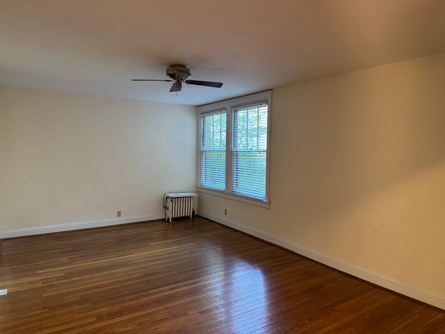 Large kitchen with stainless steel appliances (gas stove, refrigerator, dishwasher, microwave). Hardwood floors in dining room, living room, and bedroom. A large closet in the living room, bedroom and outside the bathroom. Two window AC units provided.