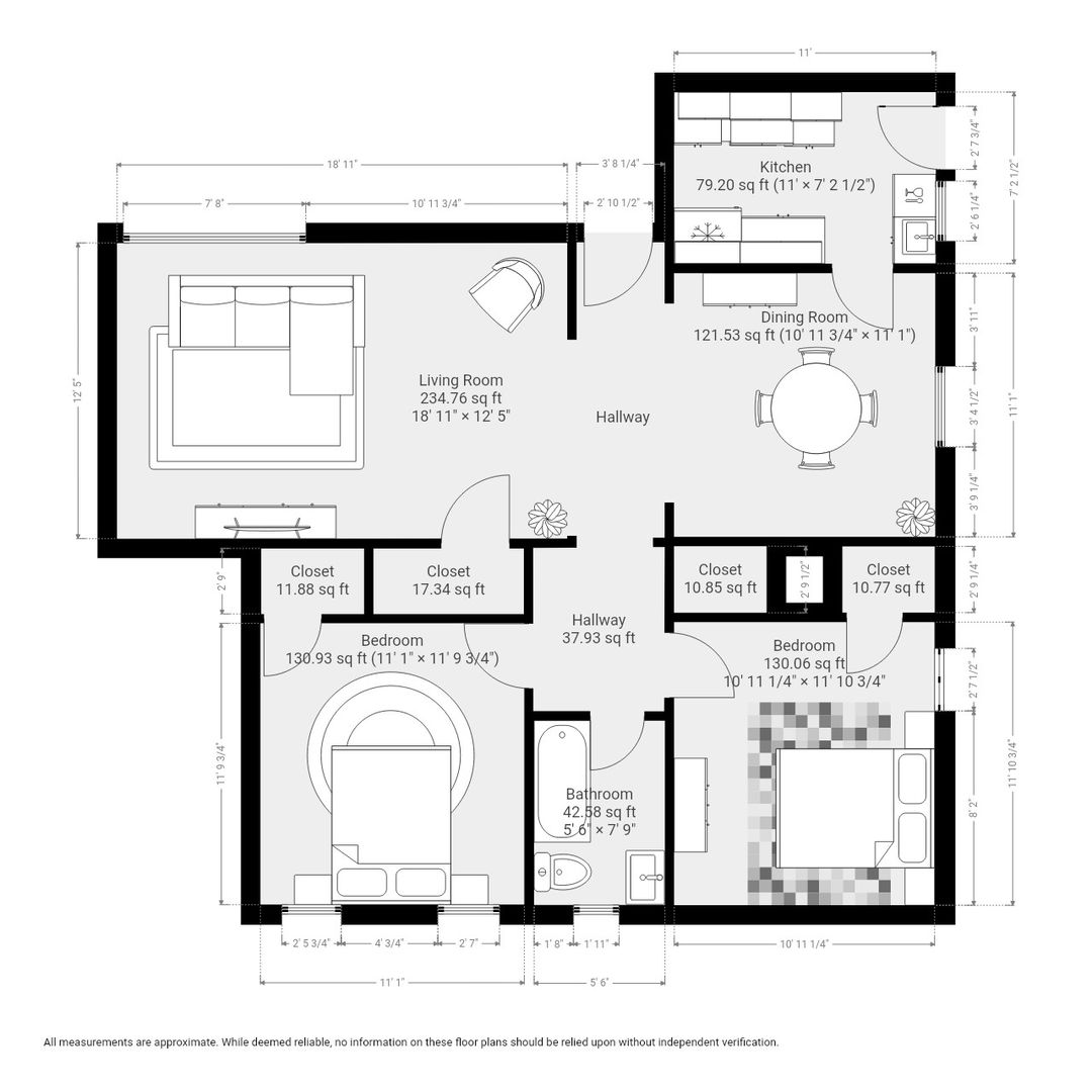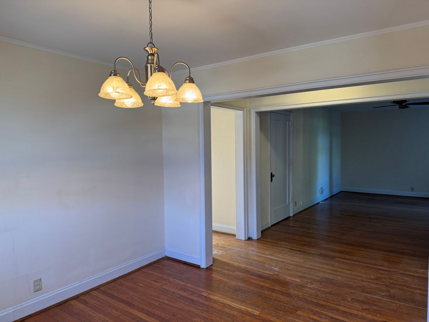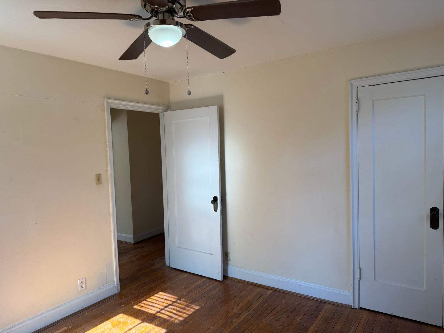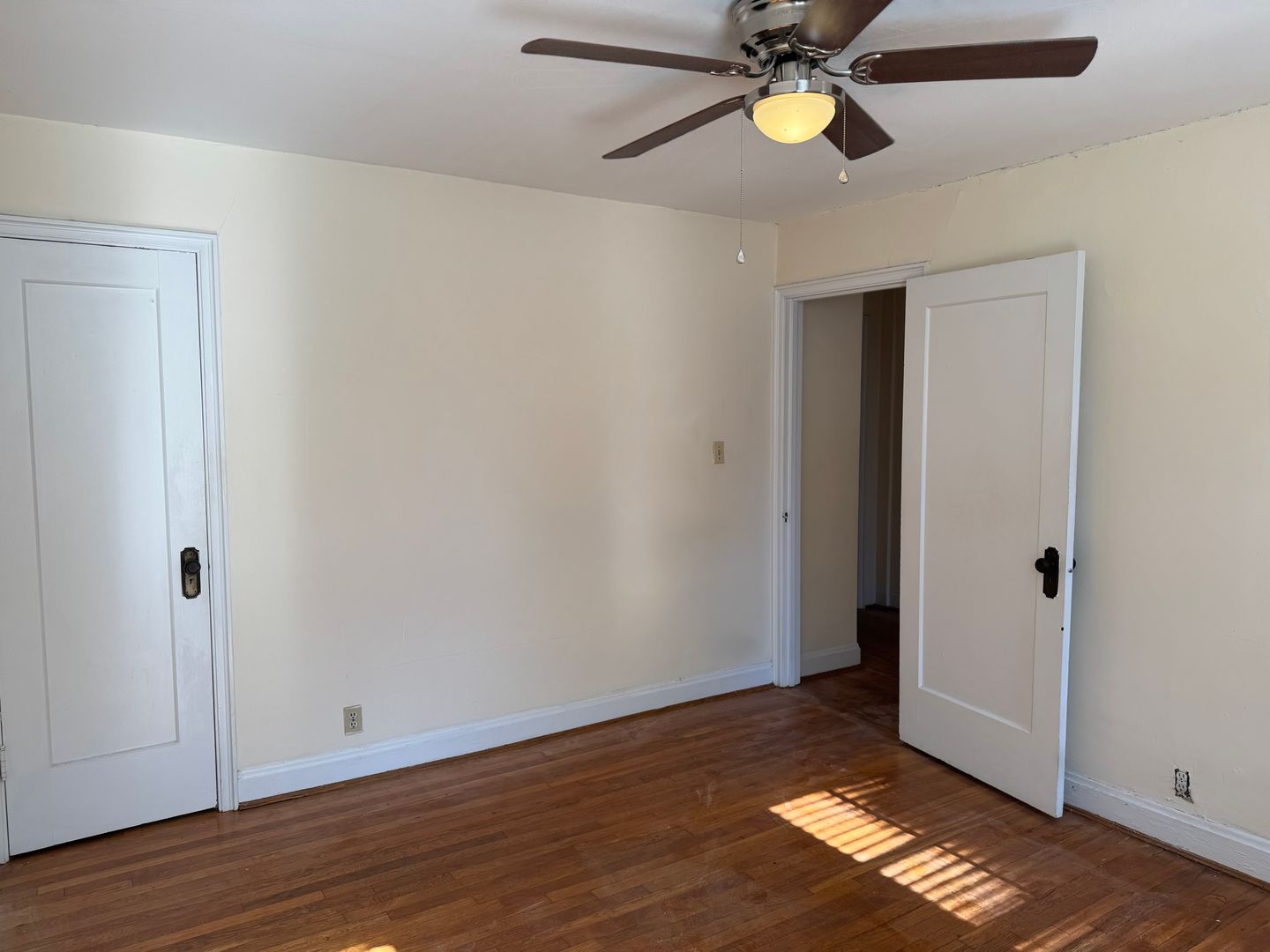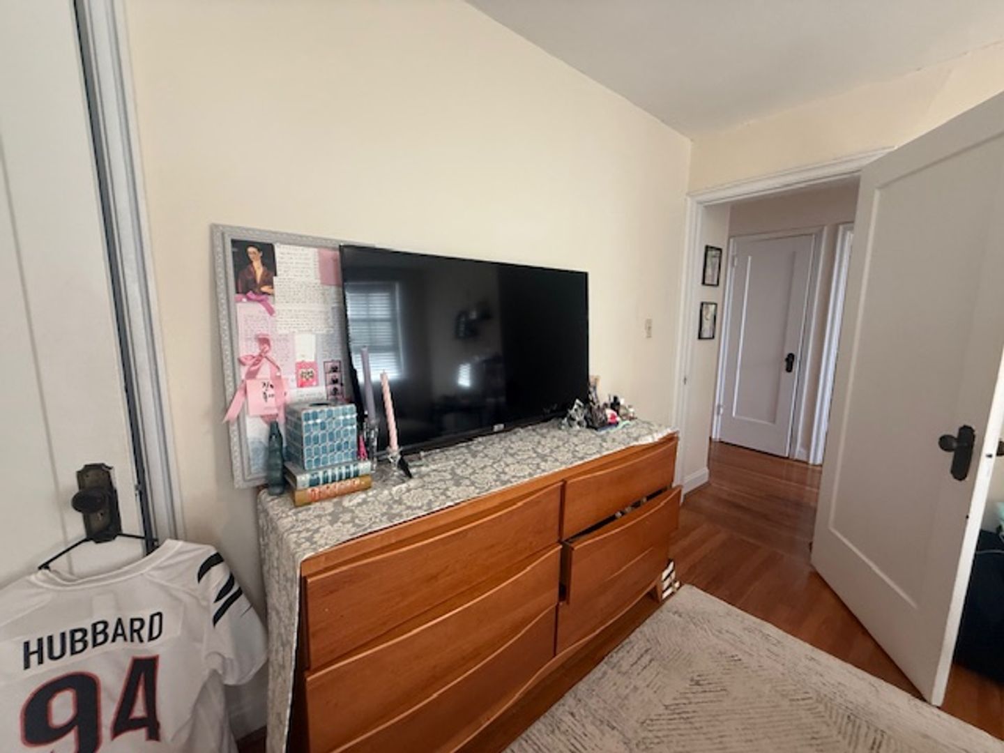 Large kitchen with stainless steel appliances (gas stove, refrigerator, dishwasher, microwave). Hardwood floors in dining room, living room, and bedroom. A large closet in the living room, bedroom and outside the bathroom. Two window AC units provided.