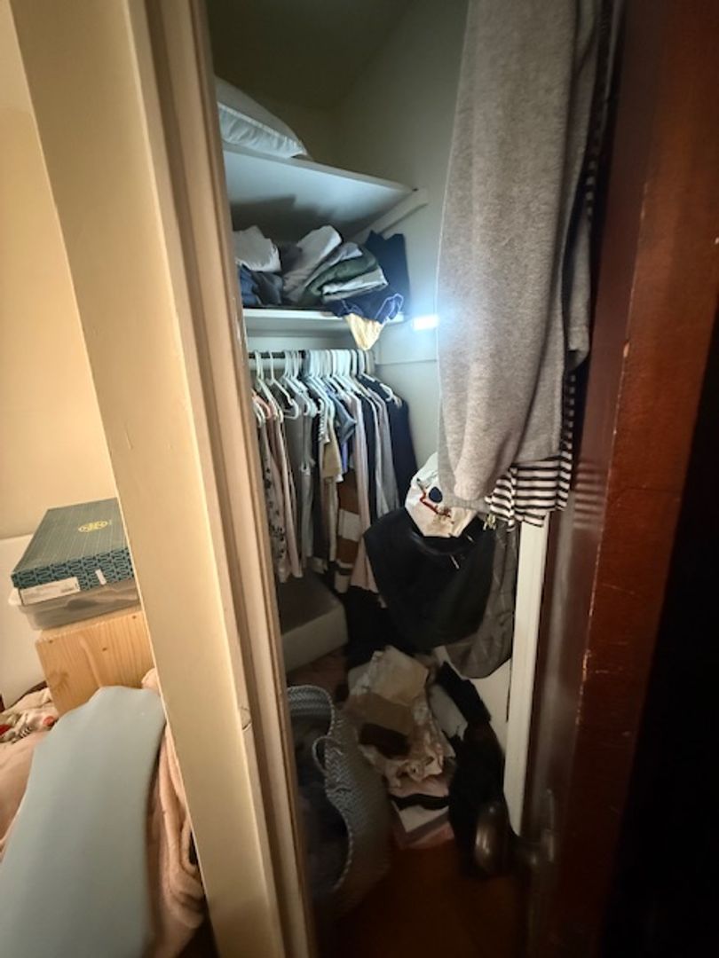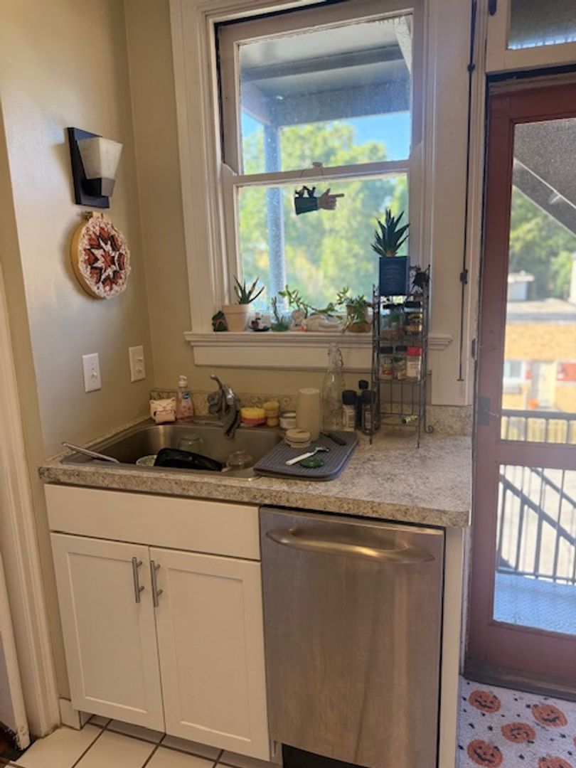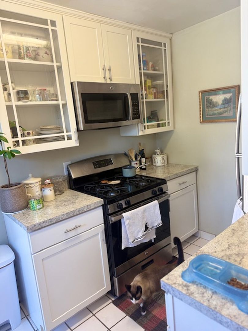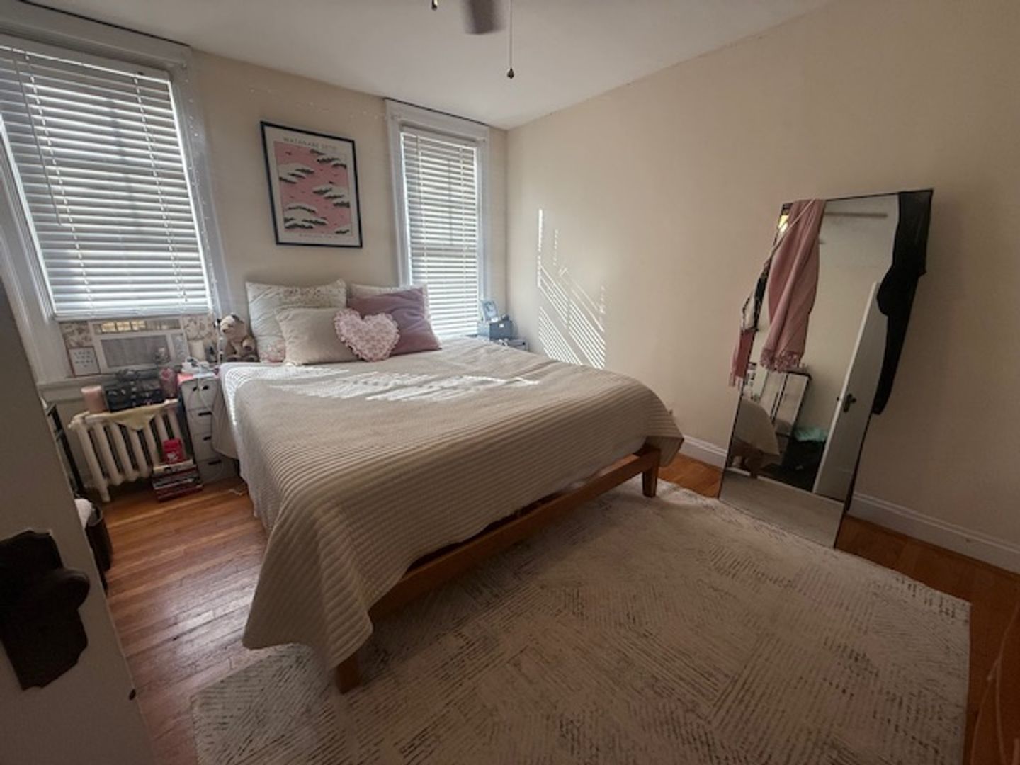 Large kitchen with stainless steel appliances (gas stove, refrigerator, dishwasher, microwave). *Please note- countertops vary slightly from actual unit. Hardwood floors in dining room, living room, and bedroom. A large closet in the living room, bedroom and outside the bathroom. Two window AC units provided.