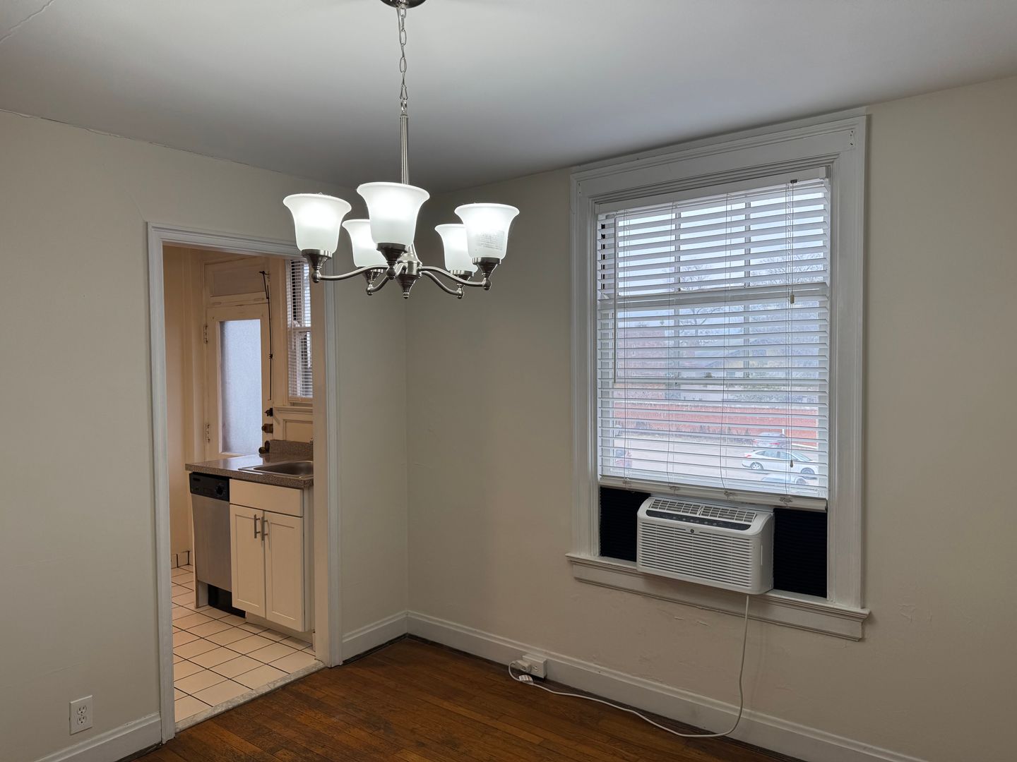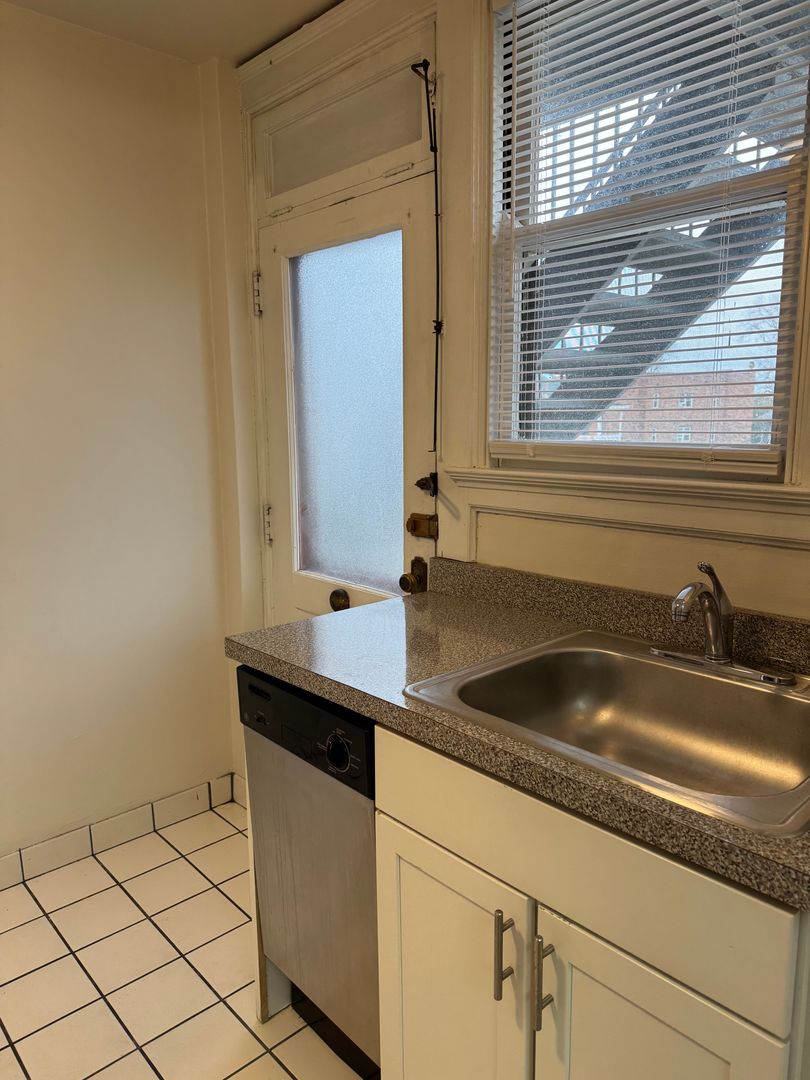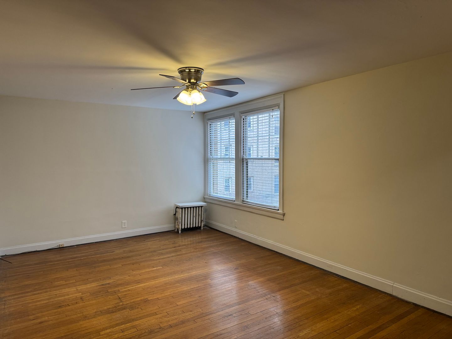Large kitchen with stainless steel appliances (gas stove, refrigerator, dishwasher, microwave). Hardwood floorsthroughout the unit, except the kitchen and bathroom, both of which are tile. A large closet in the living room, bedroom, and outside the bathroom. Window AC units provided.