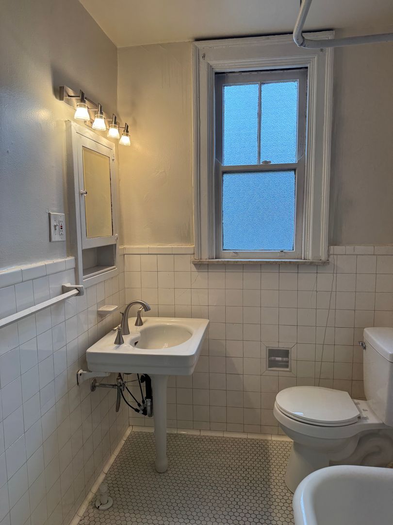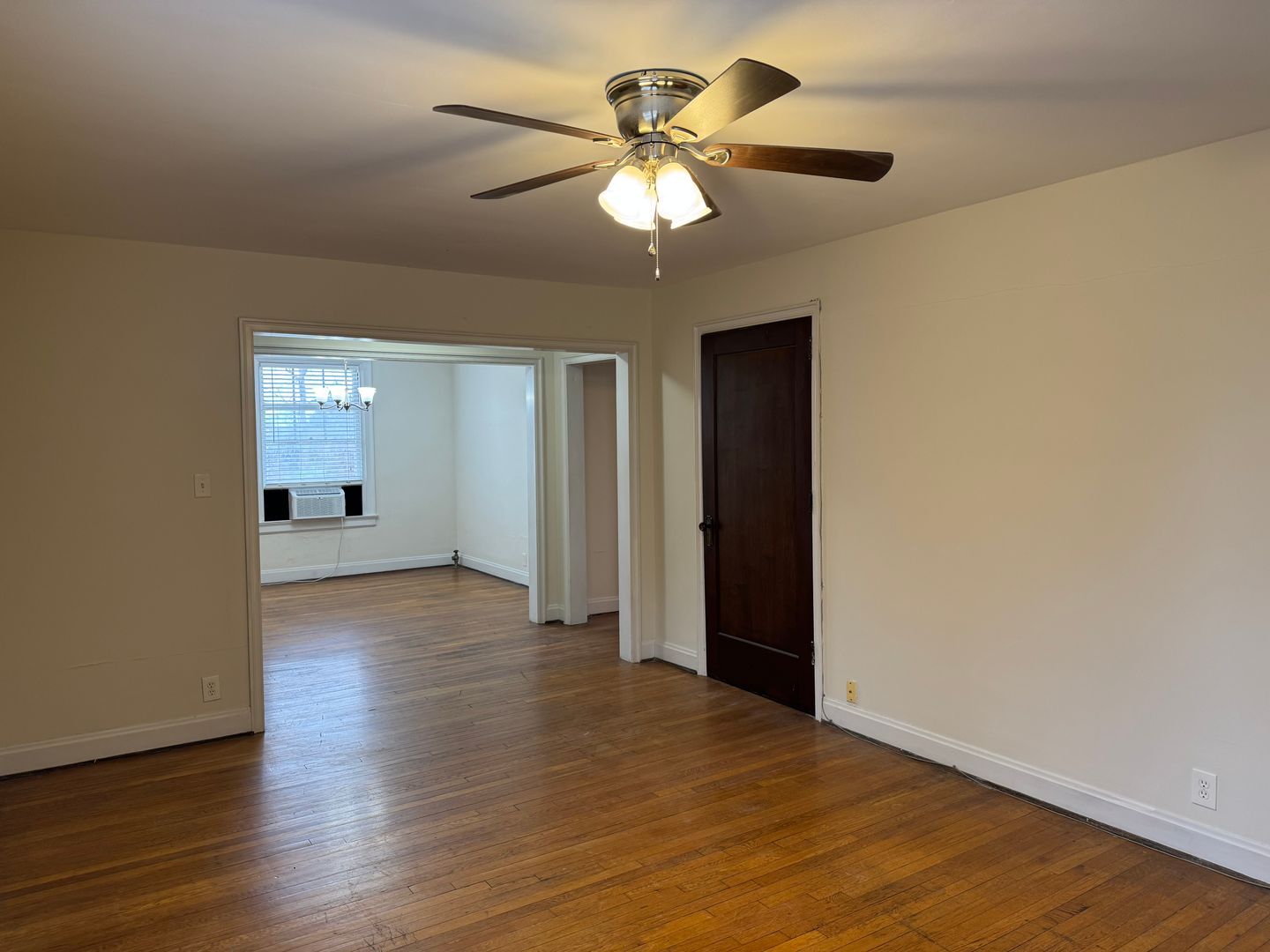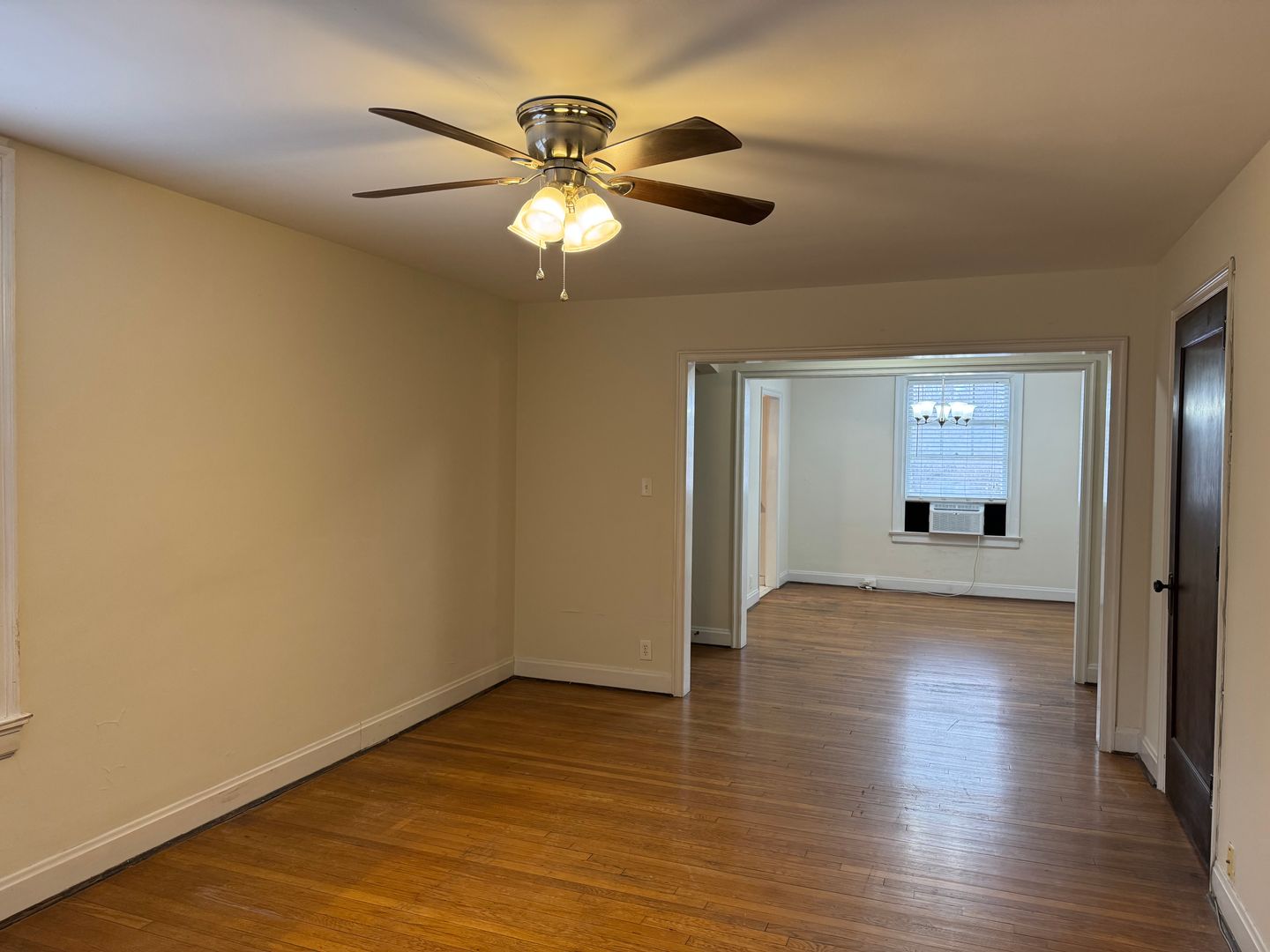 Large kitchen with stainless steel appliances (gas stove, refrigerator, dishwasher, microwave). Hardwood floorsthroughout the unit, except the kitchen and bathroom, both of which are tile. A large closet in the living room, bedroom, and outside the bathroom. Window AC units provided.